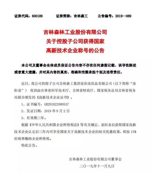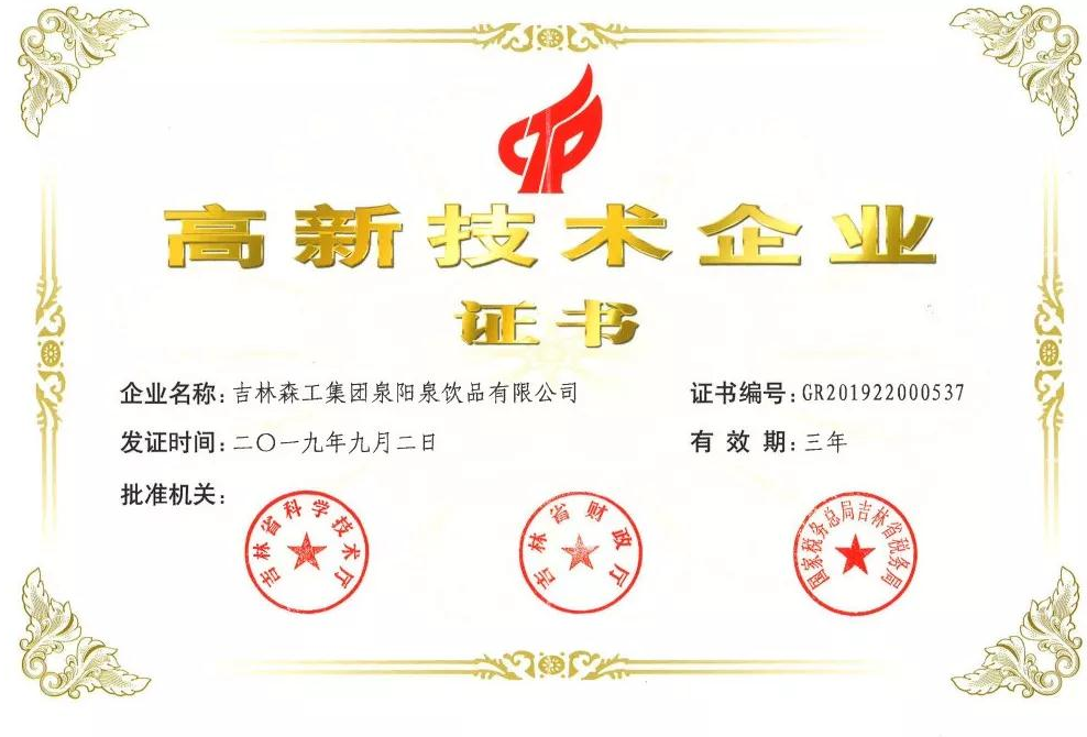 ? ? ? 根據科學技術廳、吉林省財政廳、國家稅務總局聯合頒布的《關于公布吉林省2019年第一批國家高新技術企業(yè)認定結果的通知》,經過層層審核,吉林森工集團泉陽泉飲品有限公司由吉林省科學技術廳、吉林省財政廳、北京市國家稅務局、國家稅務總局吉林省稅務局局聯合批準下發(fā)的高新技術企業(yè)認定。